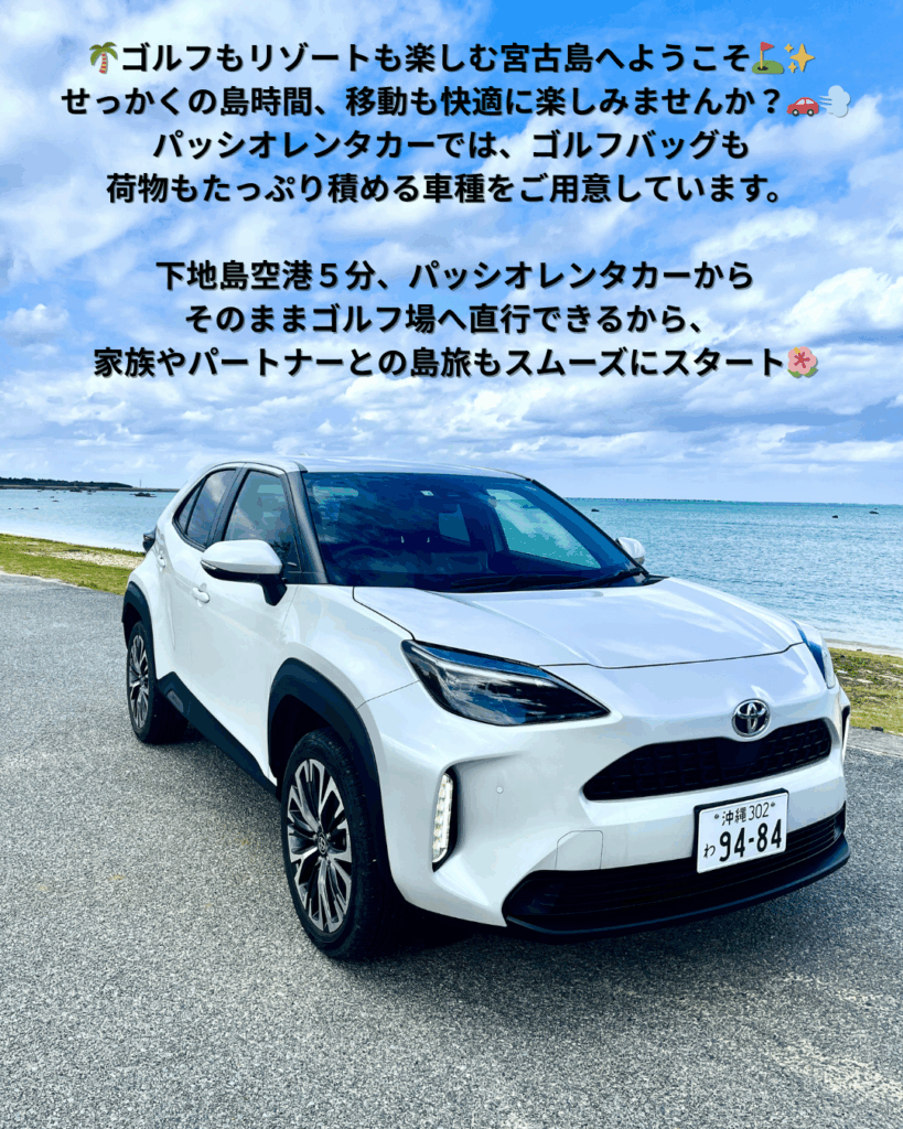 宮古島でゴルフを満喫するなら「荷物が入る」「移動がラク」「地元の情報がある」レンタカーが必須。パッシオレンタカーならその三拍子がそろっています。楽しいラウンドと穏やかな島時間を。