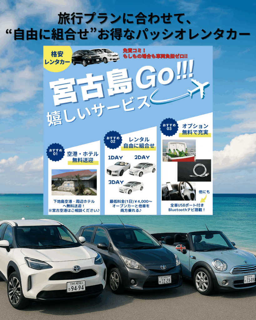 ゴルフの次の日は宮古島の絶景ドライブ「この日にオープンカーも乗りたい!」なんて事がパッシオレンタカーではできます。