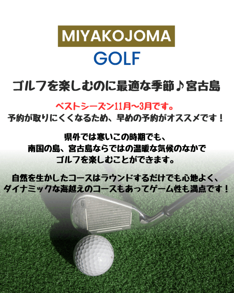 ◉宮古島ゴルフシーズン真っ只中のこの時期、ゴルフをされる方には宮古島ゴルフは人気があるため予約も取りづらくなって来ます!お早めの計画・ご予約をお勧めします。
