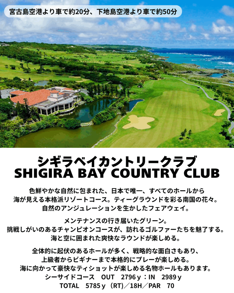 - シギラベイカントリークラブ — 海越えショットが有名。景観重視の方におすすめ。