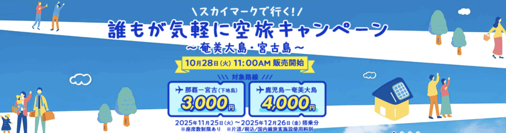 2025年11月25〜12月16日まで「スカイマーク」がキャンペーン実施中!那覇→下地空港の区間がキャンペーンしてます!格安ですね!ぜひ調べてみてください!